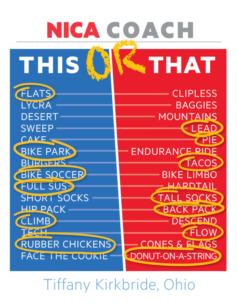 I have always been passionate about teaching. I coached gymnastics for 8 years and it really made me feel like I was making an impact on these kids’ lives. You are not only coaching a sport, you are sprinkling in life lessons at the same time whether they realize it or not. When I heard about NICA coming to Ohio, I immediately knew that I needed to bring this to my community. I transitioned from coaching competitive gymnastics to mountain biking which was a little intimidating because I was not a mountain biker. I have led adults’ and kids’ rides in our community and really found a love for cycling on pavement and some gravel. Once I started riding in the woods, it was just like stepping into a whole new world.